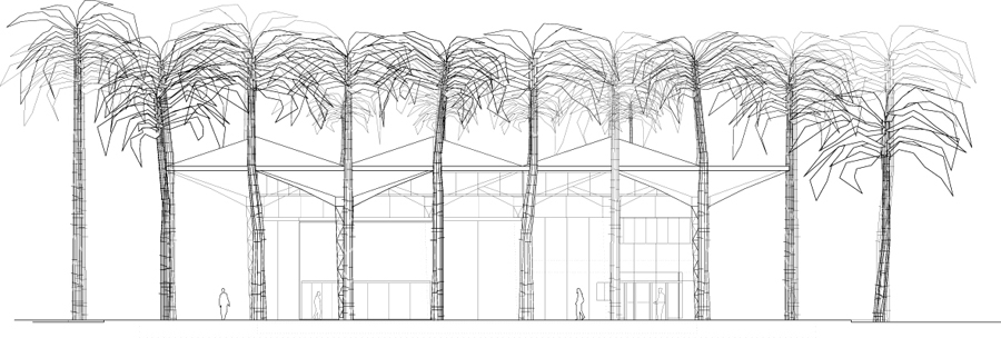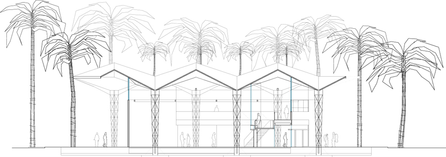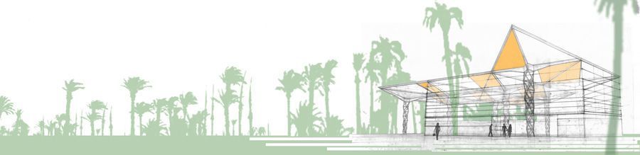 La palmera natural, agrupada, se confunde con las construidas, configurando un ámbito único de gran capacidad evocadora. No hay límites, el espacio se acota, se delimita, se acondiciona, pero se concibe en continuidad con el exterior.