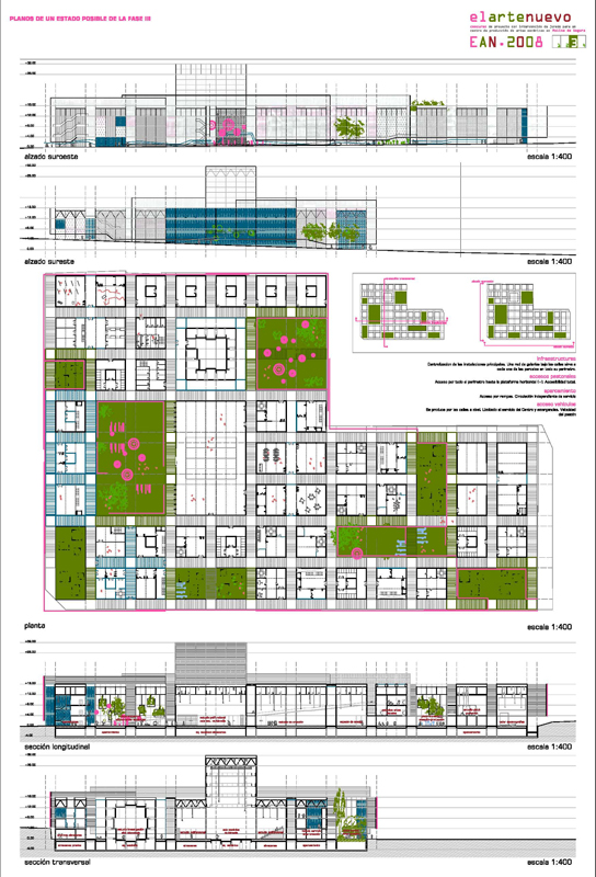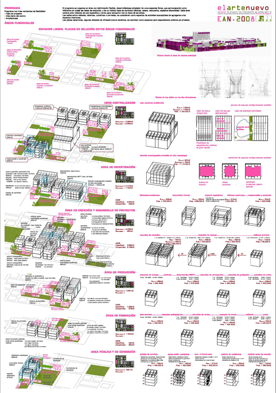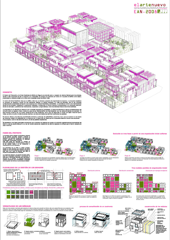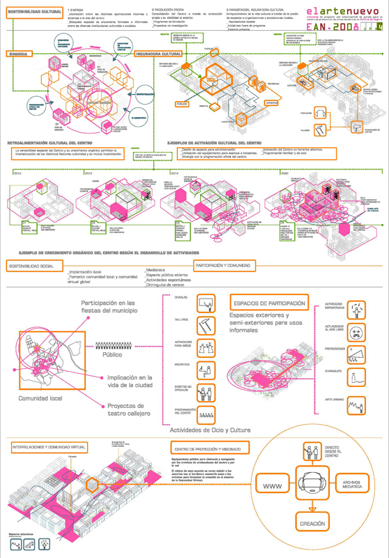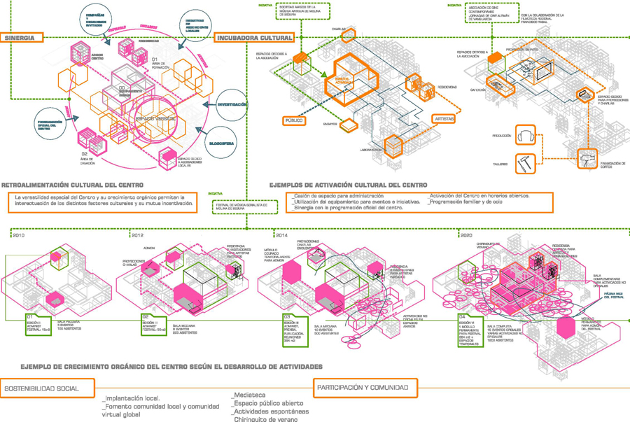 El caracter abierto y las distintas sensibilidades (artistica, ambiental, de habitabilidad, económica, etc.), que se muestran en las bases del concurso, invitan a la realización de un programa con un desarrollo por fases que en la propuesta abarca al menos tres vertientes: la de proyecto, la de la vida diaria del centro y la de las posibles ampliaciones.