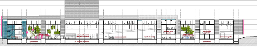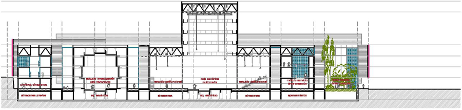 Un centro de Artes Escénicas más que un edificio, debe ser un sistema o proyecto de organización de espacios. La propuesta establece un conjunto de espacios a partir de dos elementos básicos: el módulo equipado y la calle de actividad, que en las múltiples configuraciones proyectadas configuran unos espacios de la máxima flexibilidad y versatilidad.