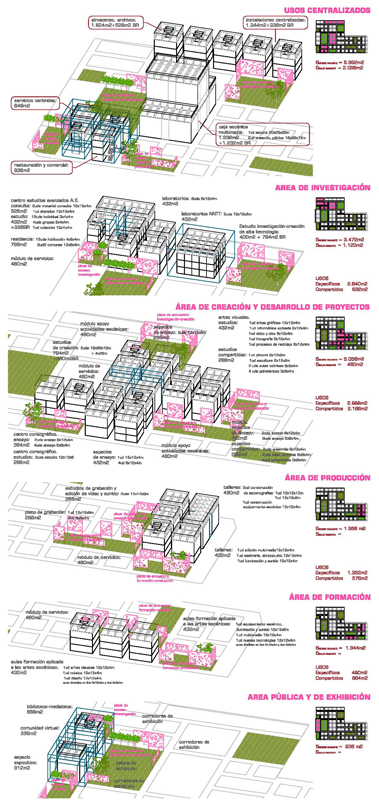 El programa se organiza en áreas con delimitación flexible. desarrollándose alrededor de unos espacios libres, que permanecerán como referente en todas las fases de evolución. y de un módulo base de servicios (oficinas, aseos, vestuarios, espacios disponibles). Cada área tendrá unos módulos de uso específico y otros para compartir con el resto de las áreas.