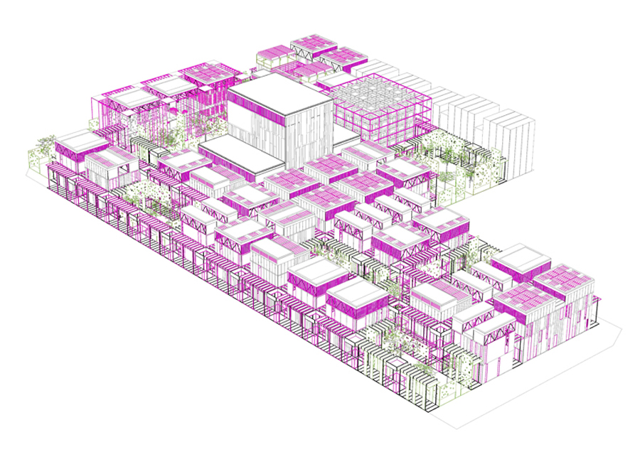 La propuesta no se identifica en absoluto con la llamada 'arquitectura contenedor'. El matiz de diferencia lo aporta el entendimiento del conjunto como un espacio urbano, donde los usos de los módulos-edificio se interrelacionan con las calles-corredores de actividad. En este sentido el Centro es una ciudad, Ciudad de las Artes Escénicas, que si bien se desarrolla al margen del tejido industrial que la rodea, se abre a la calle a través de plazas abiertas y de velos tamizados que delimitan sutilmente los espacios.