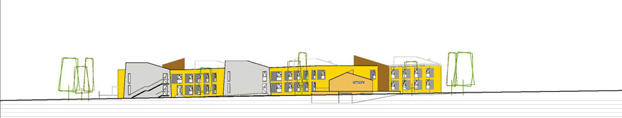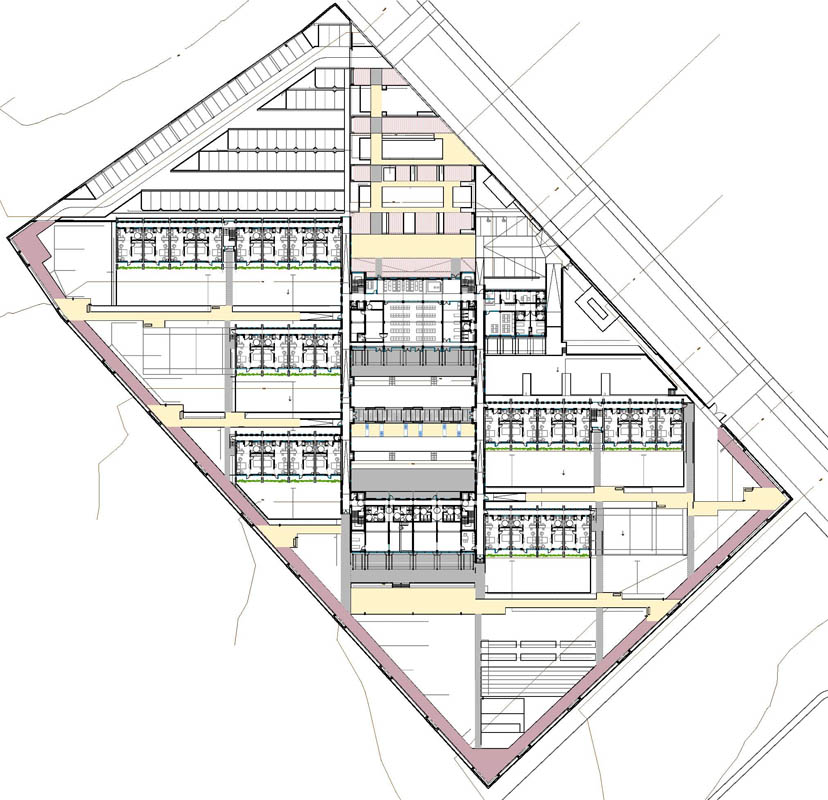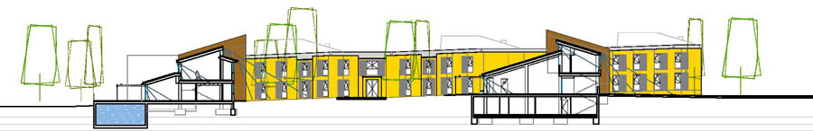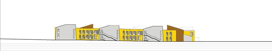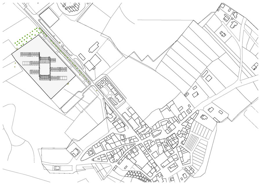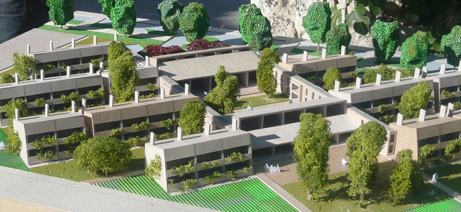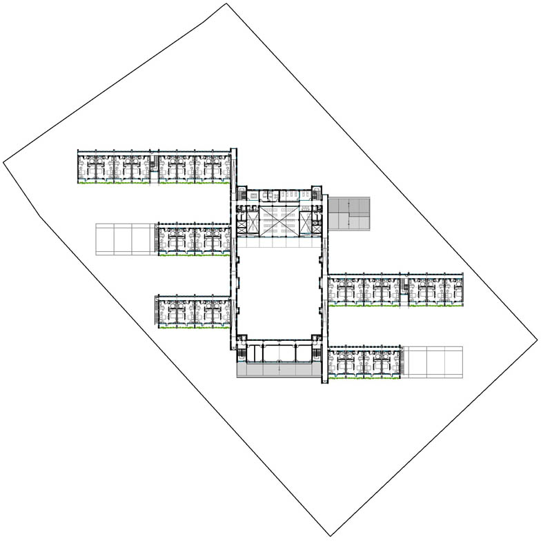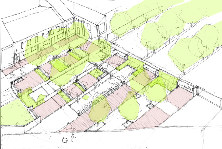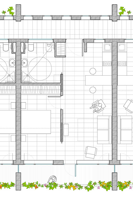 Este concepto se materializa en agrupaciones de edificaciones interconectadas que huyen del bloque compacto con recepción y pasillos para generar espacios permeables, saludables y abiertos a la naturaleza con las necesarias zonas comunes organizadas en torno a un gran patio y las viviendas agrupadas en torno a patios más domésticos que se abren a los lados hacia la parcela.