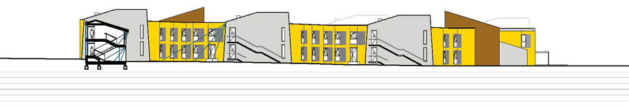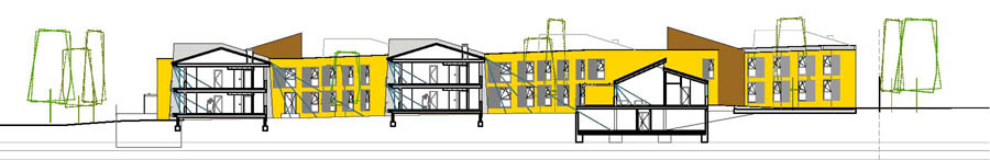El proyecto se plantea como sucesión progresiva y sosegada de espacios de intimidad creciente. Desde el lugar público por excelencia que sería la calle del pueblo pasamos a la Plaza de Acceso, el Vestíbulo, las zonas de reunión y el Comedor; se llega luego a las Galerías abiertas de comunicación (lugares perfectos para el encuentro), la zona de gimnasia y actividades, el jardín posterior, los patios ajardinados hasta recogernos en los Módulos Habitacionales con intimidad total.